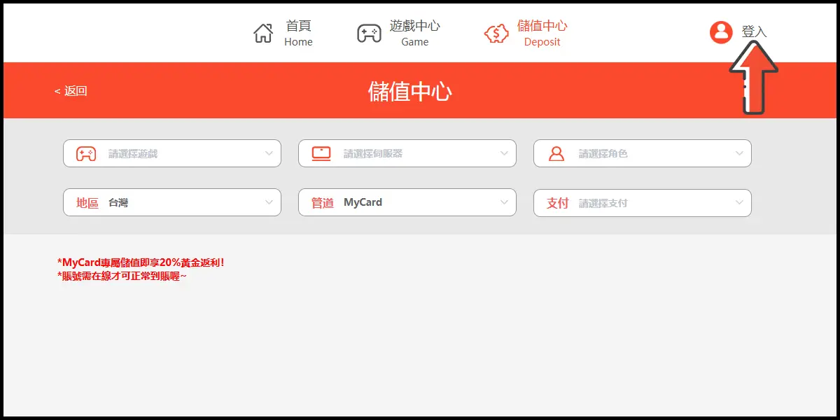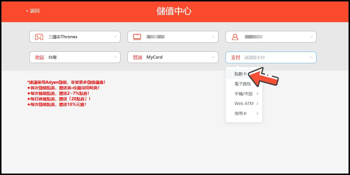 選擇好欲儲值的遊戲角色後,支付方式選擇「MyCard點數卡」。