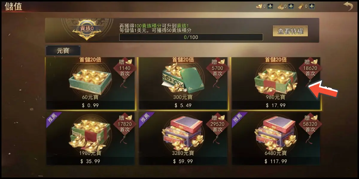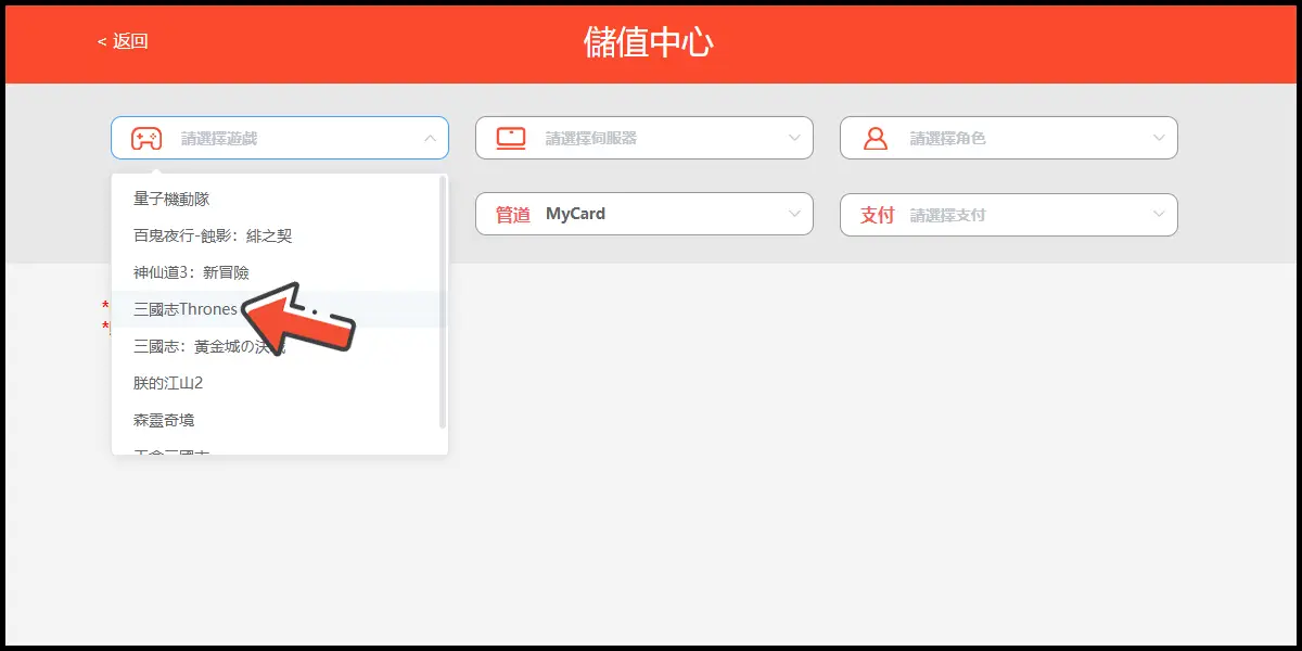 登入會員中心後,點選「儲值」,並選擇「三國志Thrones」這款遊戲。