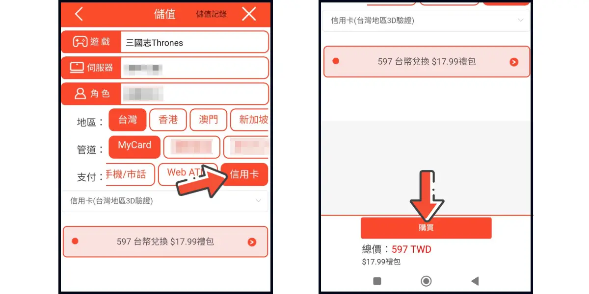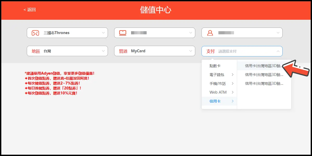 選擇好欲儲值的遊戲角色後,支付方式選擇「MyCard信用卡(台灣地區3D驗證)」。