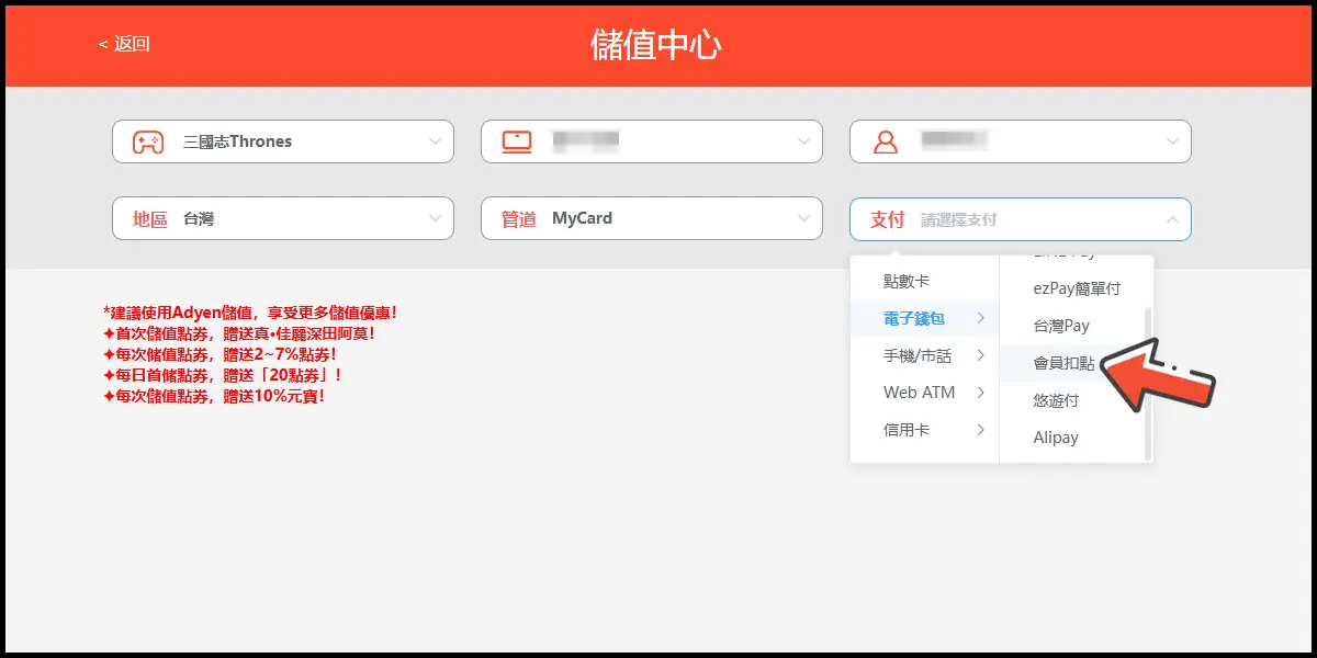 選擇好欲儲值的遊戲角色後,支付方式選擇「電子錢包」裡面的「MyCard會員扣點」。