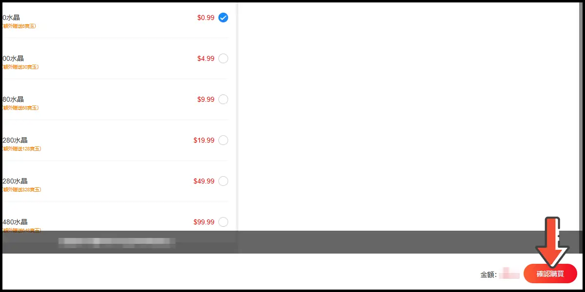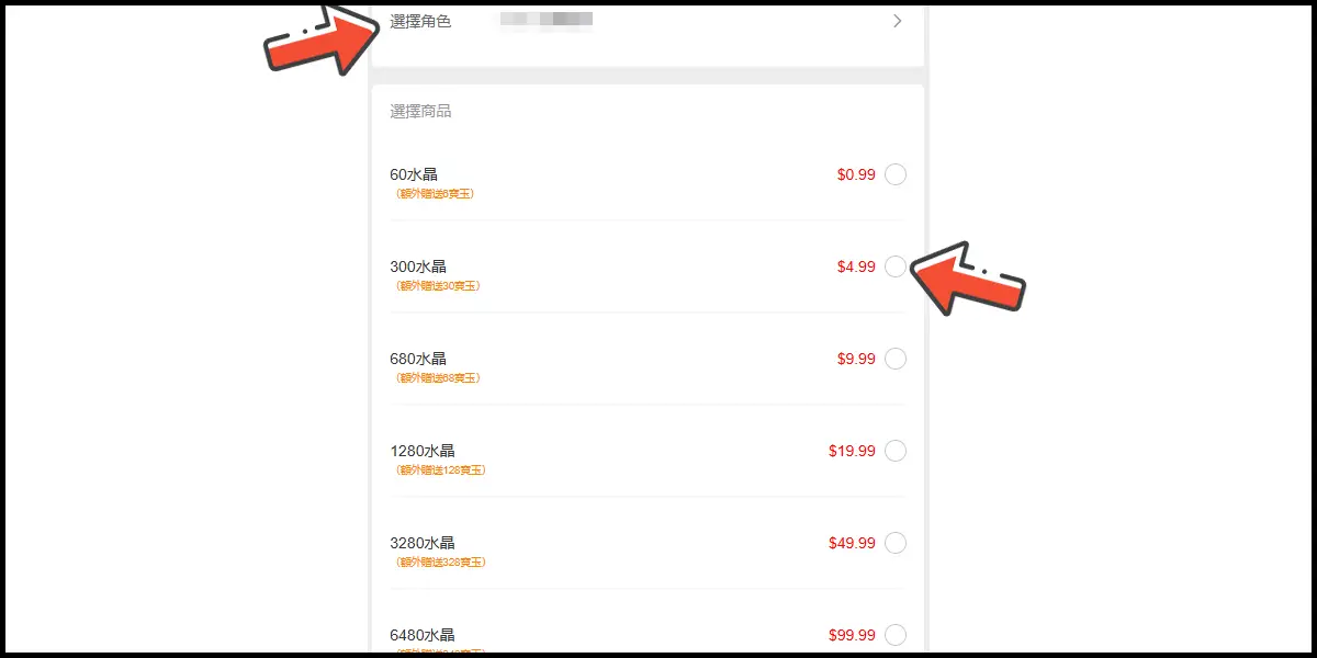 選好遊戲角色後選擇儲值商品,選擇完畢後點選「確認購買」。