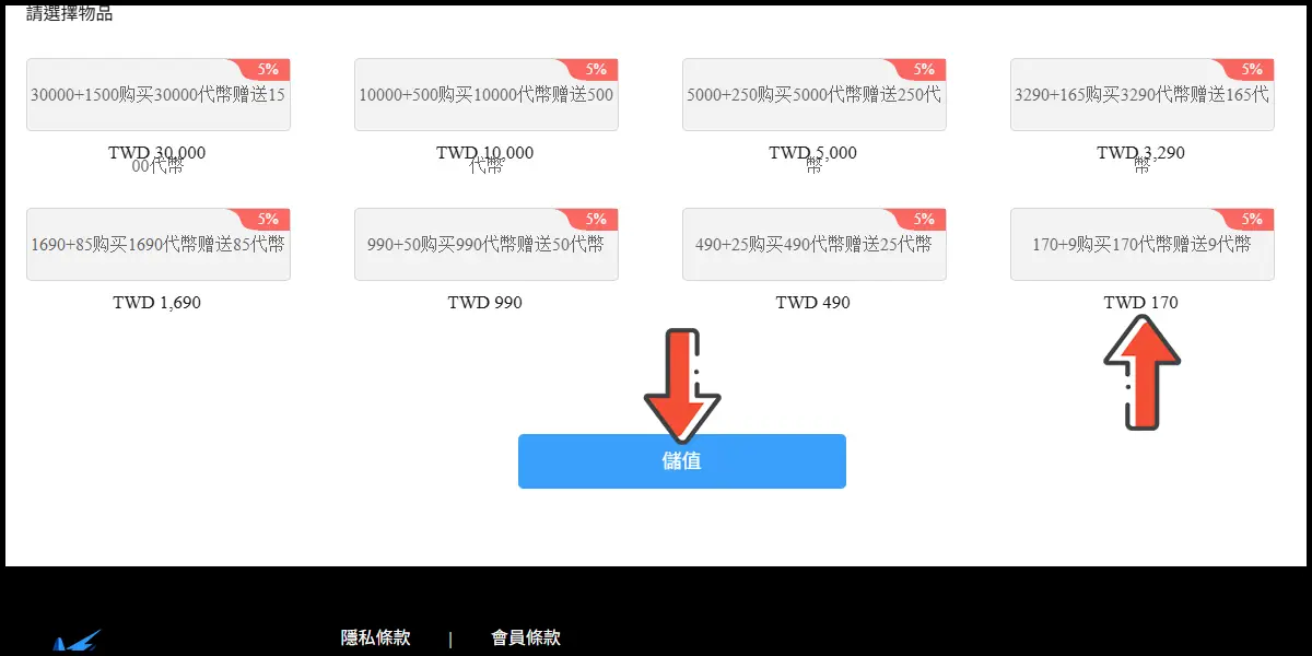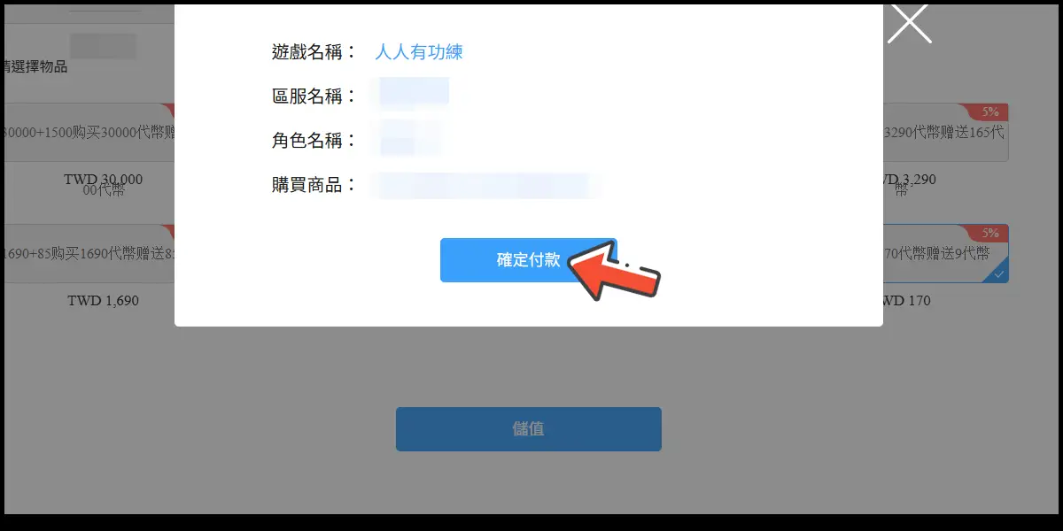 選擇儲值商品,商品確認無誤後點選下方儲值,並在跳出視窗再次檢查完畢後點選「確認付款」。