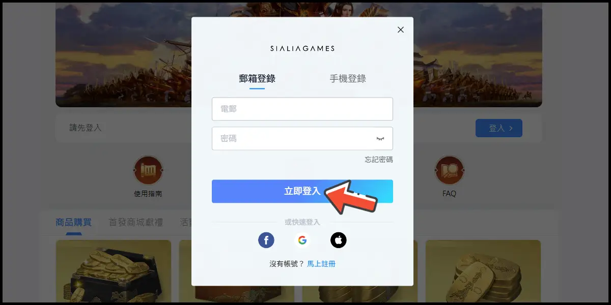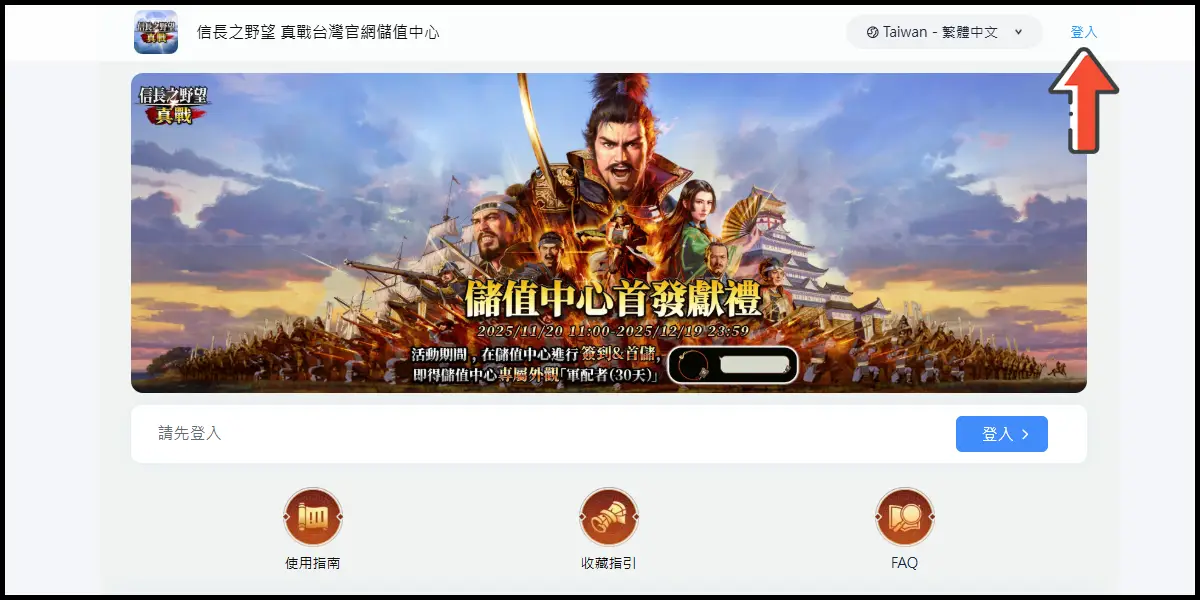 前往儲值網站後,點選右上角登入你的遊戲帳號。