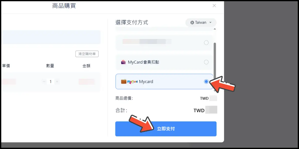 檢查訂單資訊無誤後,支付方式選擇「MyCard」,並點選「立即支付」前往儲值。