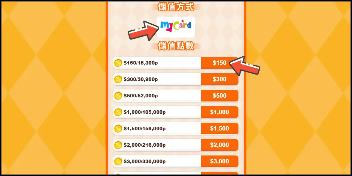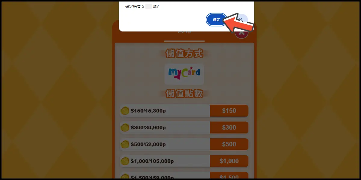 儲值方式選擇「MyCard」,選擇儲值金額,並在跳出視窗點選確定。