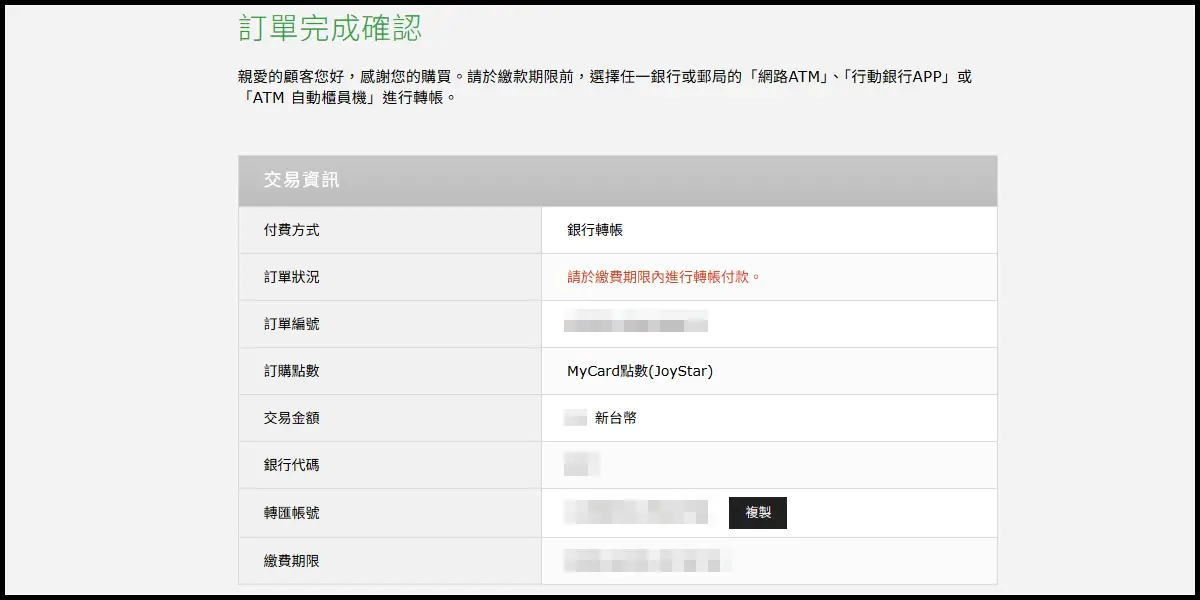訂單確認後,跟著銀行轉帳指示即可完成儲值。