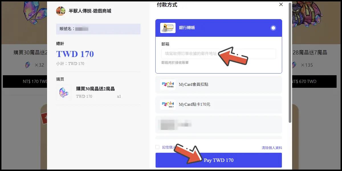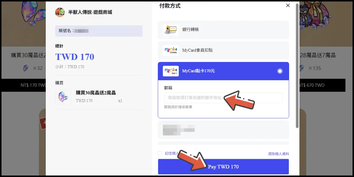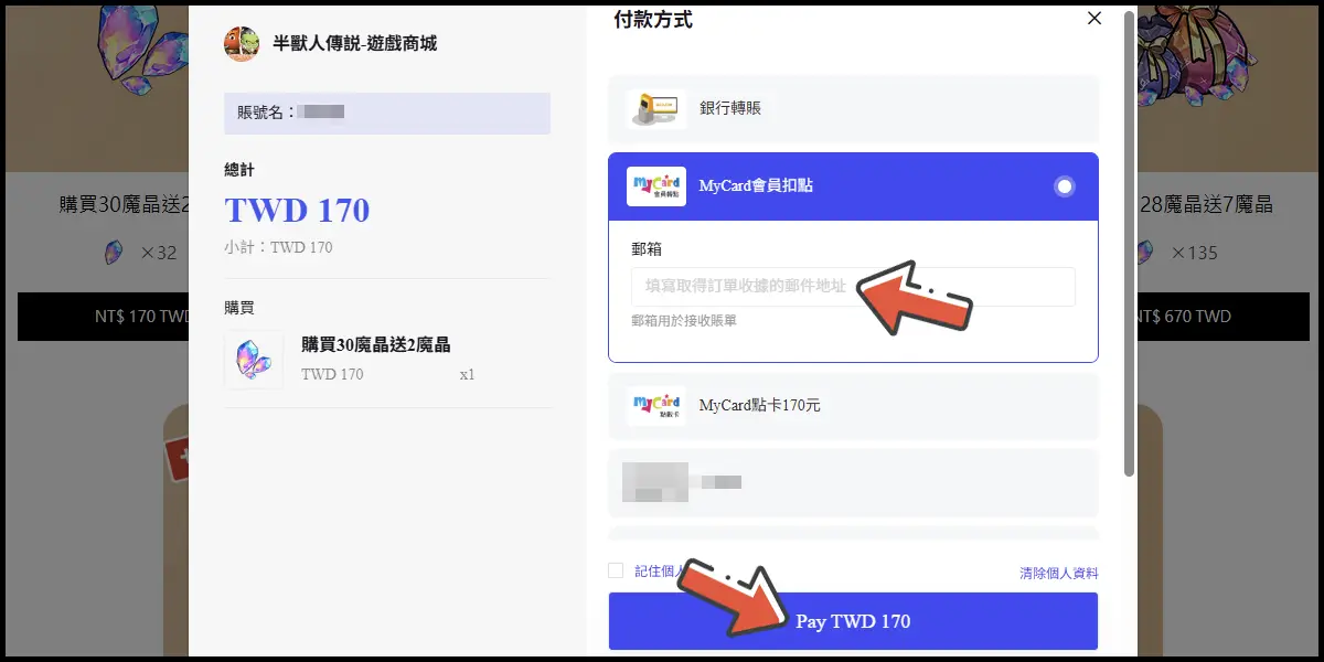 付款方式選擇「MyCard會員扣點」,填寫帳單電子郵件後點擊下方「Pay」。