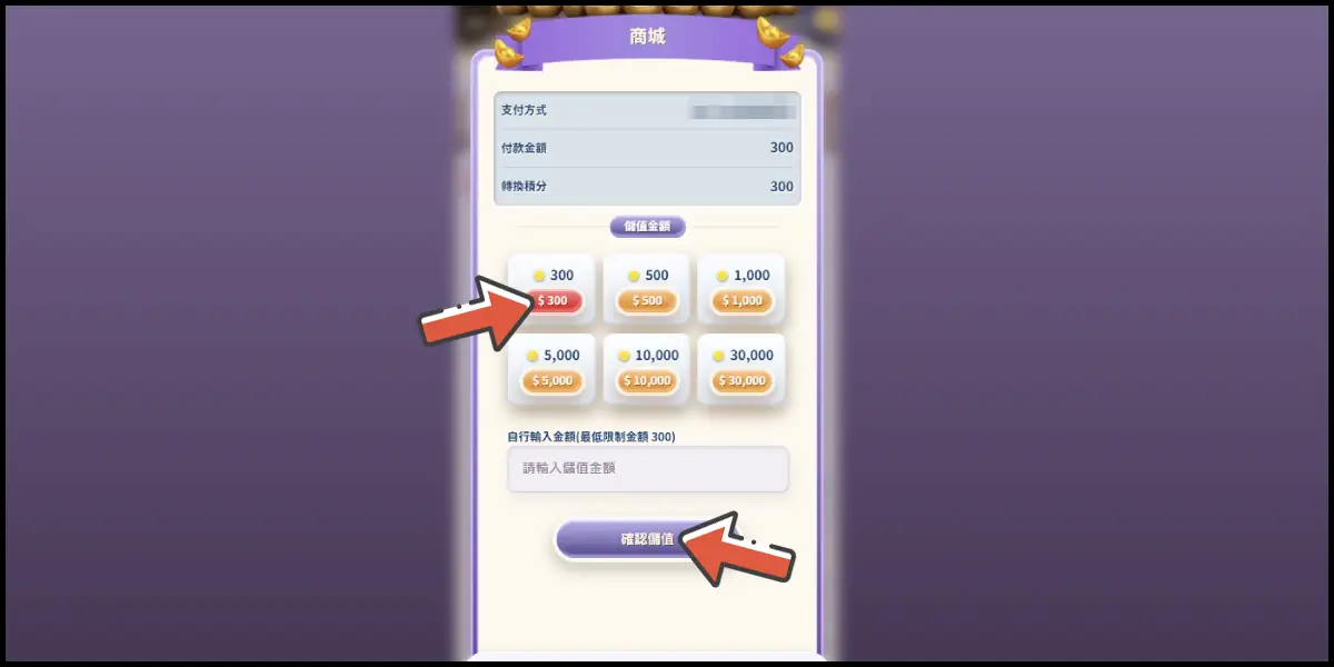 選擇儲值金額,並點擊「確認儲值」。