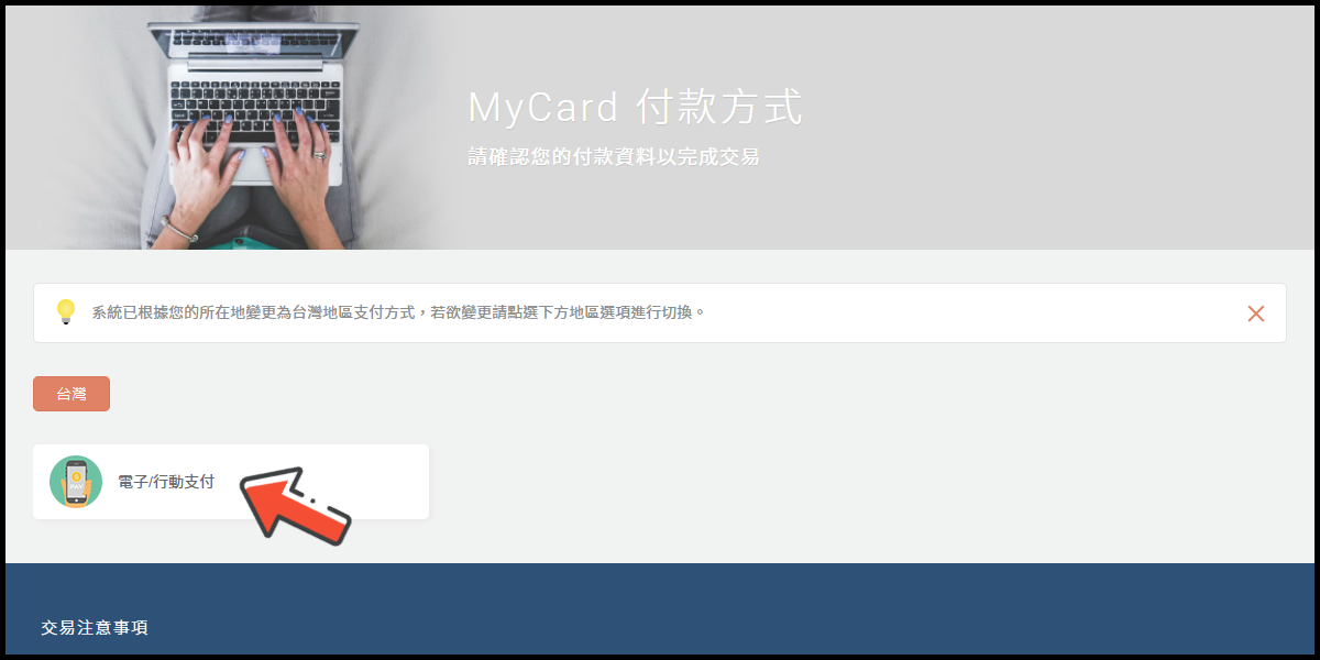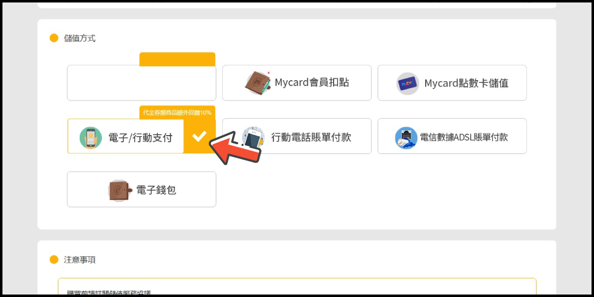 付款方式選電子/行動支付。(此儲值教學使用電子/行動支付為範例)