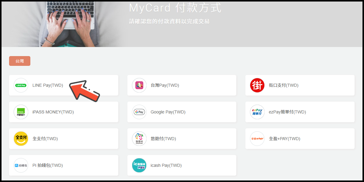 付費類別選電子/行動支付、LINE PAY (TWD)。(此儲值教學使用LINE PAY電子/行動支付為範例)