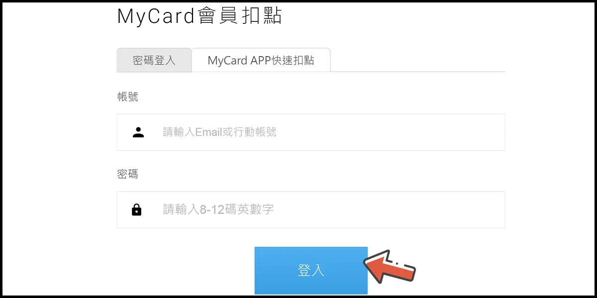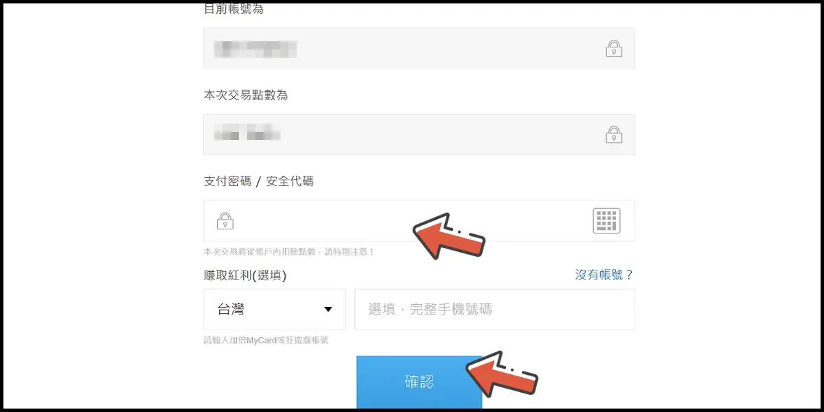 登入MyCard會員,輸入支付密碼及手機(選填),點選確認即完成交易。或使用MyCard APP快速扣點,請跳至步驟7。