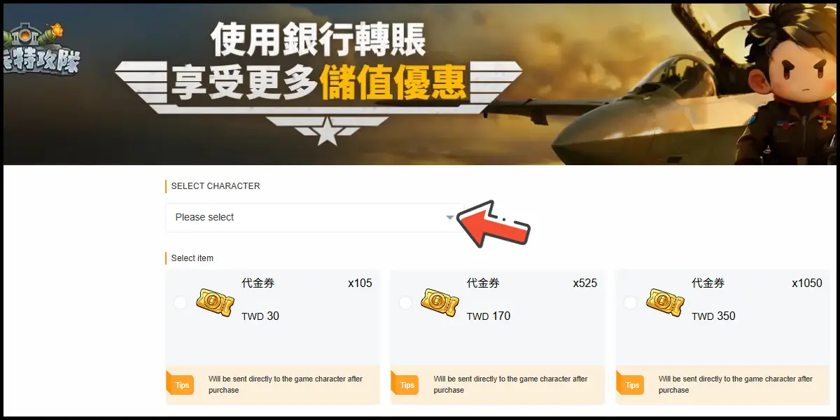 前往儲值網站後,登入你的遊戲帳號,選擇「小兵特攻隊」這款遊戲,並選擇自己的遊戲角色。