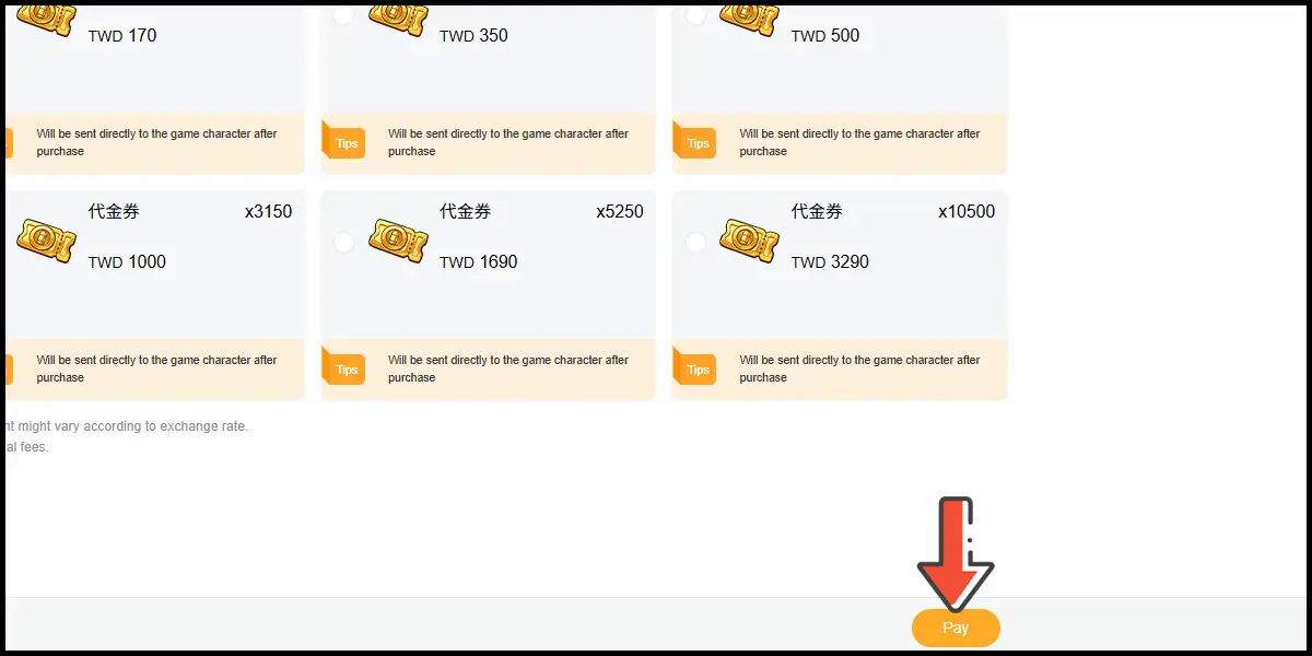 選擇儲值金額,選擇完畢後點選右下角的「Pay」。
