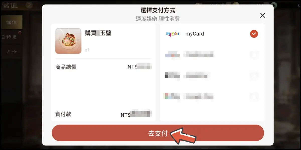 選擇儲值品項,支付方式選擇「MyCard」後點選「去支付」。