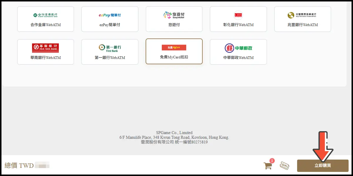 支付方式選擇「MyCard扣點」,選擇完畢點選右下方「立即購買」。。