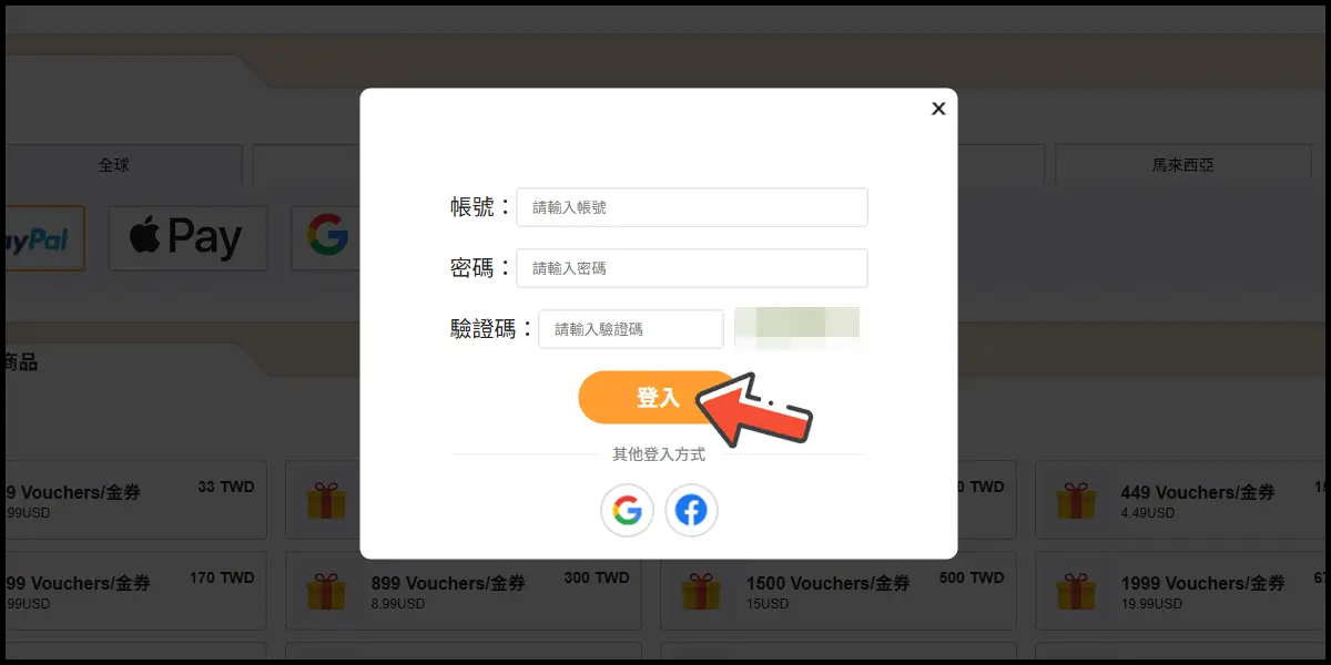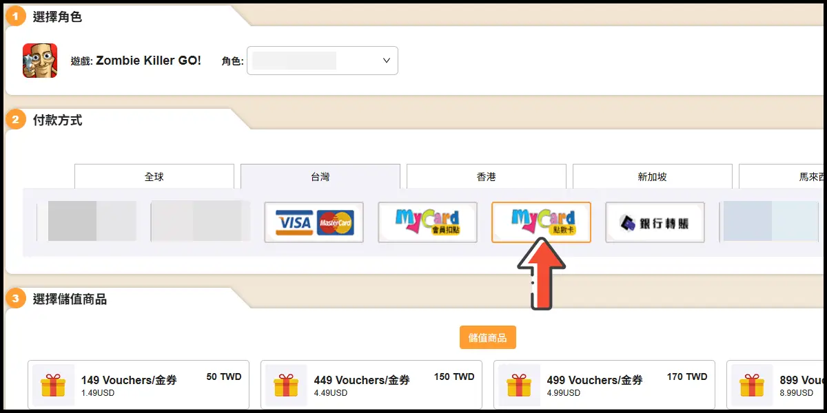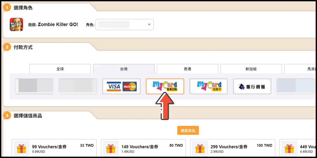 前往儲值網站後,登入你的遊戲帳號並選擇你的角色。