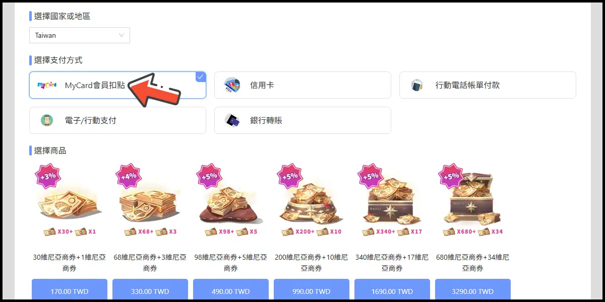 若您的會員帳號內尚未有任何點數,可先參考MyCard會員點數儲值教學將您於超商、門市或購物網站購買的點數卡儲值進您的會員帳號;或於官網使用線上支付方式儲值點數,來進行後續會員扣點交易。
