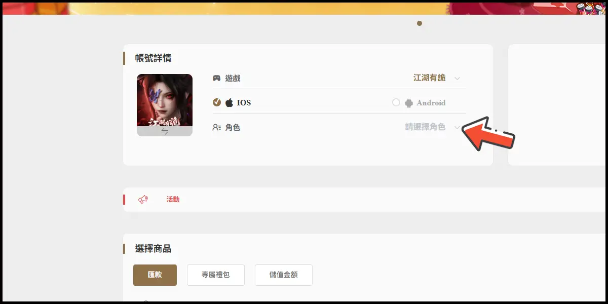 前往儲值網站後,遊戲選擇「江湖有詭」,並登入你的遊戲帳號。