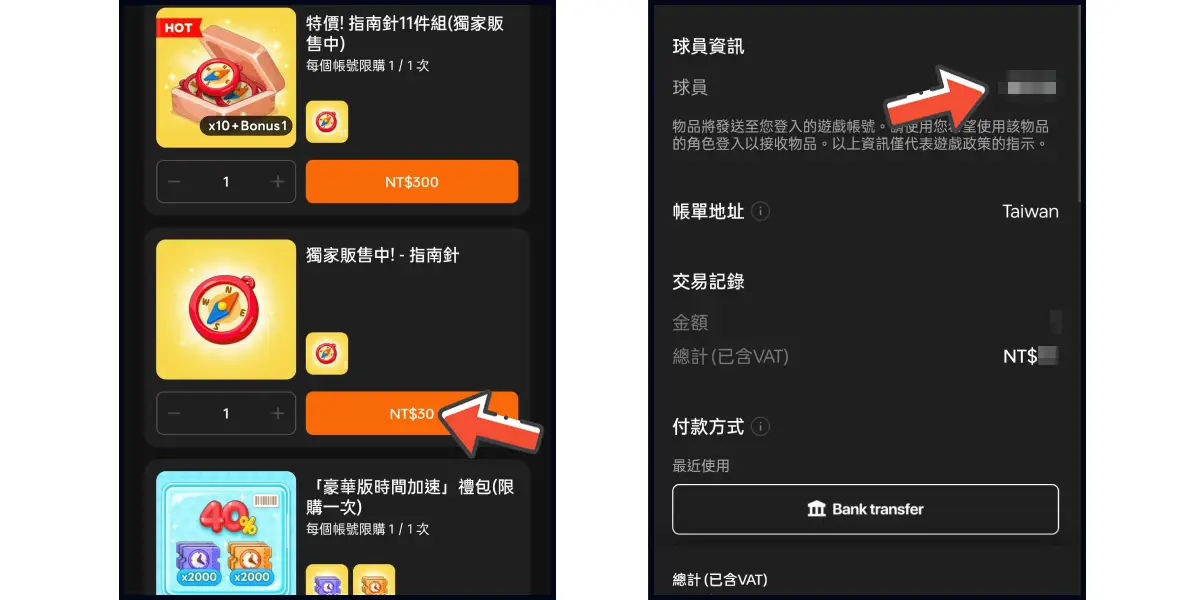 選擇儲值品項,並確認欲儲值的帳號無誤。