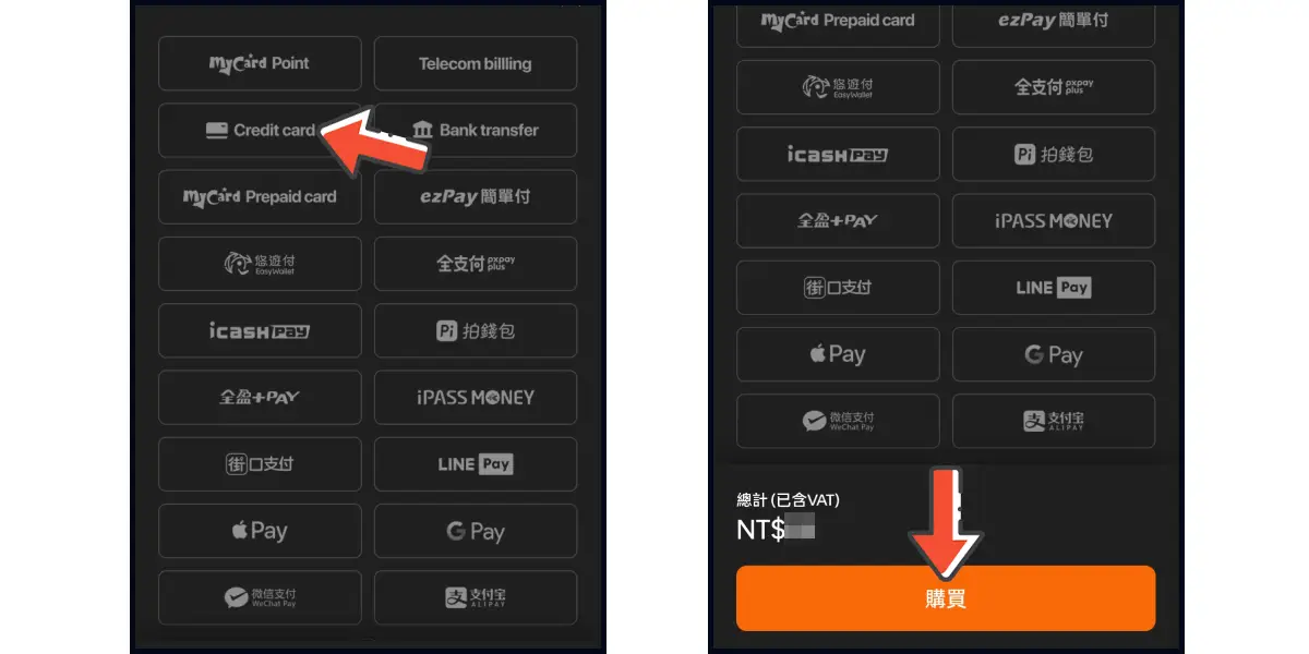 選擇「Credit card」,並點選下方「購買」前往儲值。