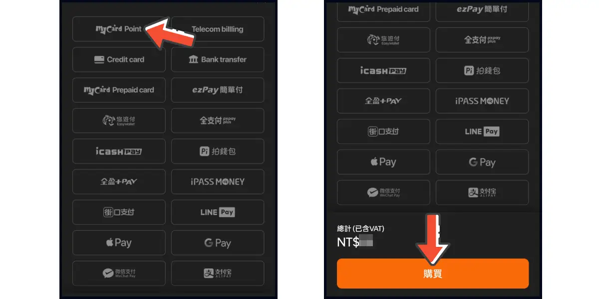 選擇「MyCard Point」,並點選下方「購買」前往儲值。
