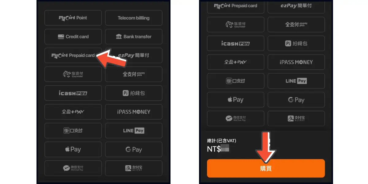 選擇「MyCard Prepaid card」,並點選下方「購買」前往儲值。