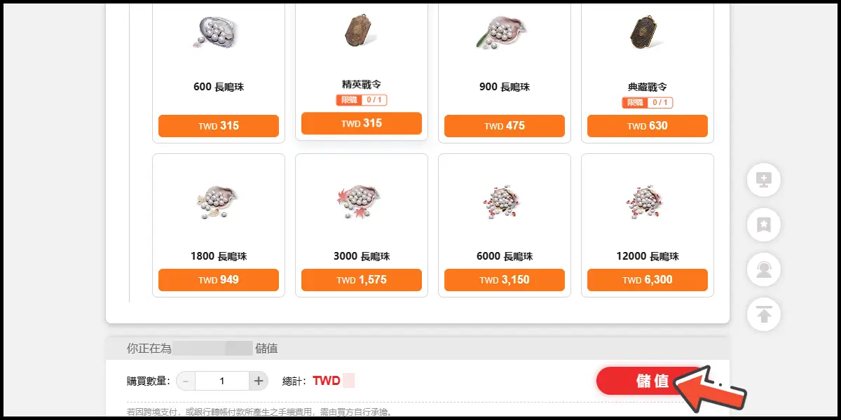 選擇儲值商品,選擇種類和數量完畢後點選右下角「儲值」。