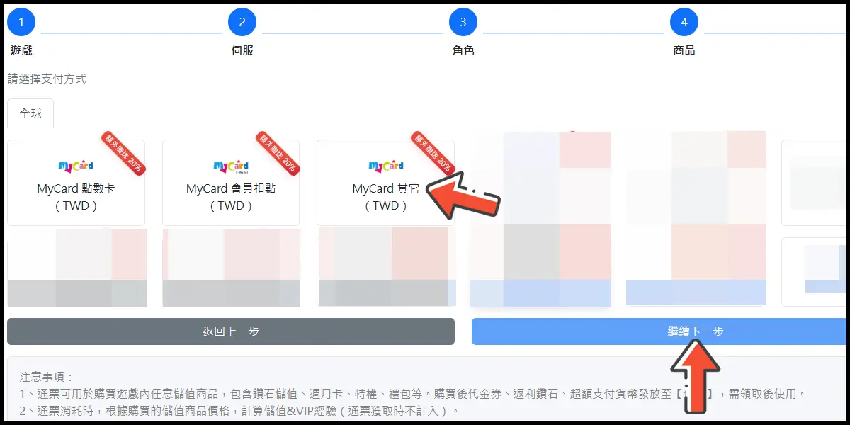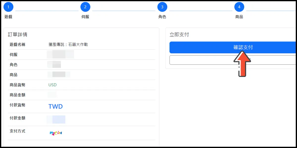 選擇儲值商品,支付方式選擇「MyCard其他」,訂單商品確認無誤後點選「確認支付」。