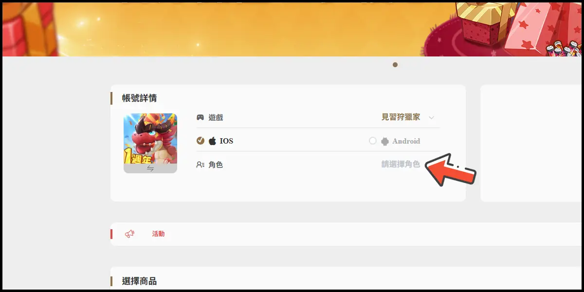前往儲值網站後,遊戲選擇「見習狩獵家」,並登入你的遊戲帳號。