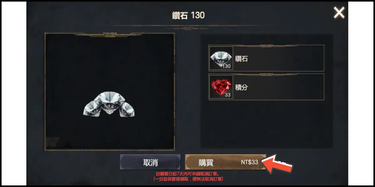 選擇儲值品項,確認商品資訊後並點選「購買」。
