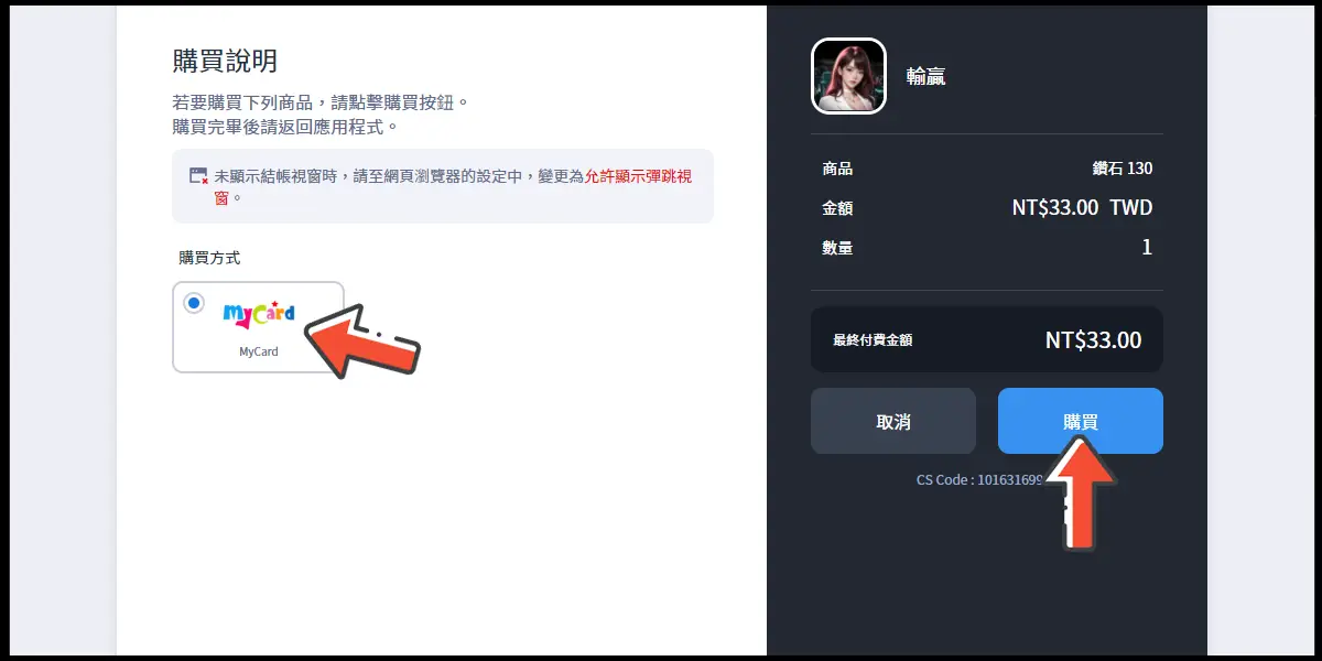 購買方式選擇「MyCard」,商品資訊確認無誤後點選「購買」。