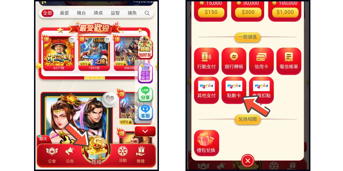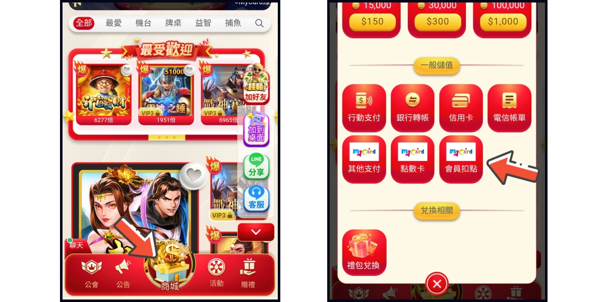 點擊下方選單中的商城圖,付款方式選擇MyCard點數卡。