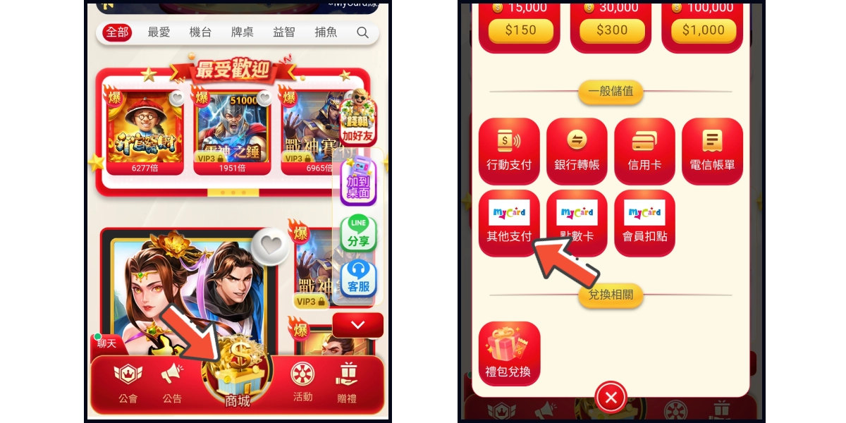 點擊下方選單中的商城圖,付款方式選擇MyCard其他支付。