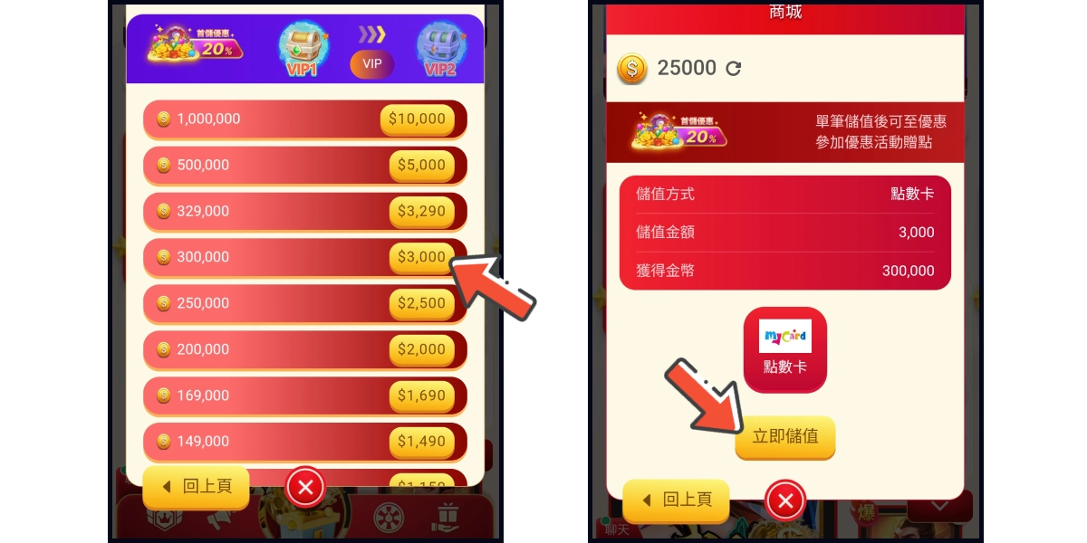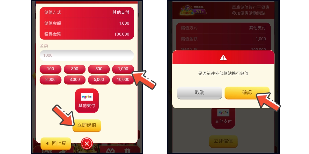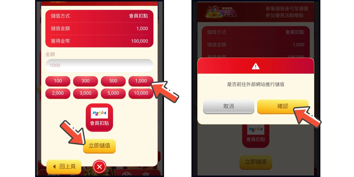 選擇儲值面額後點擊立即儲值,再點擊確認。