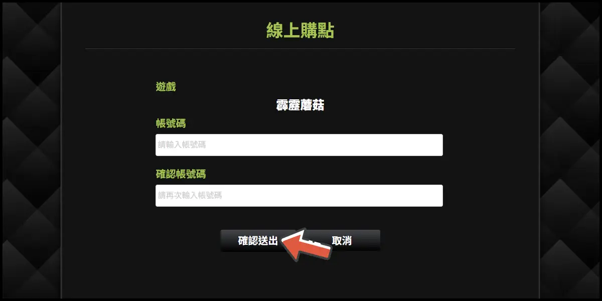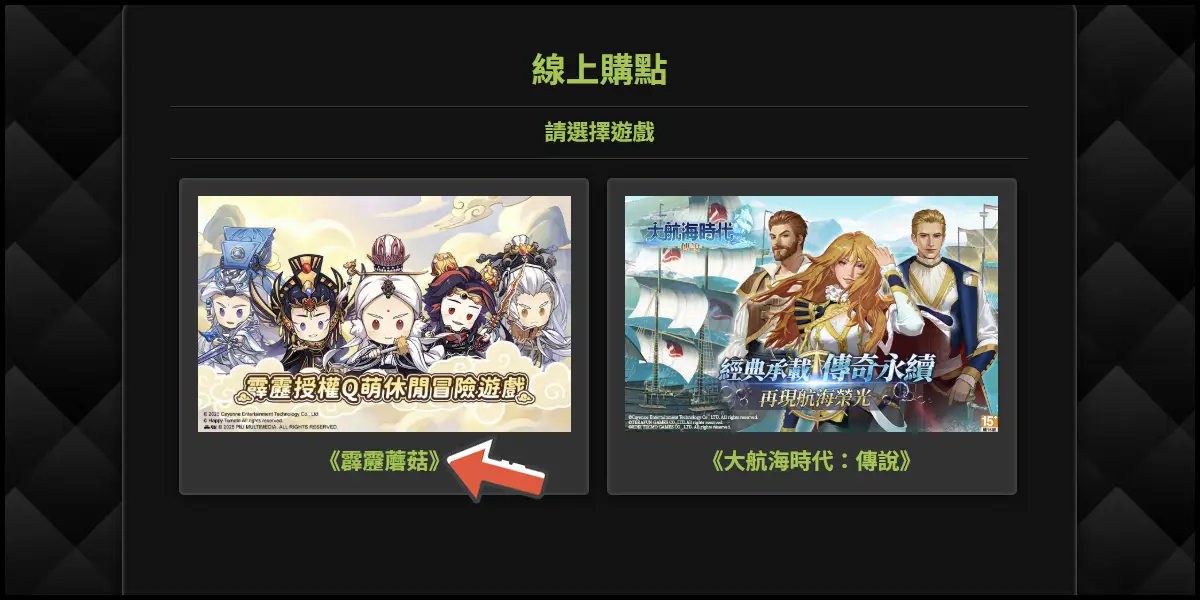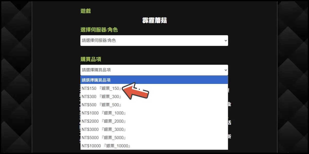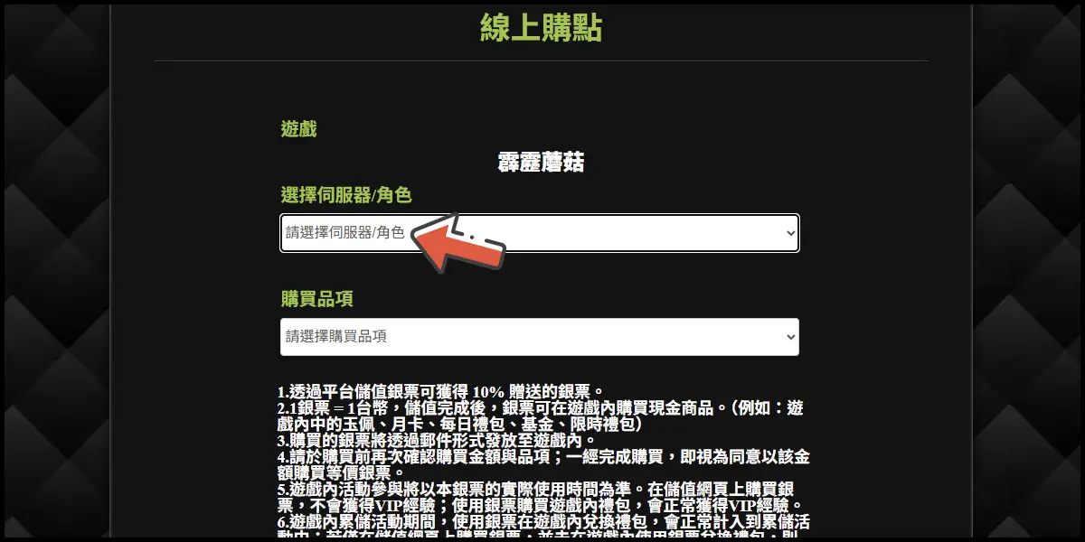 前往儲值網站後,選擇「霹靂蘑菇」這款遊戲並登入你的遊戲帳號。