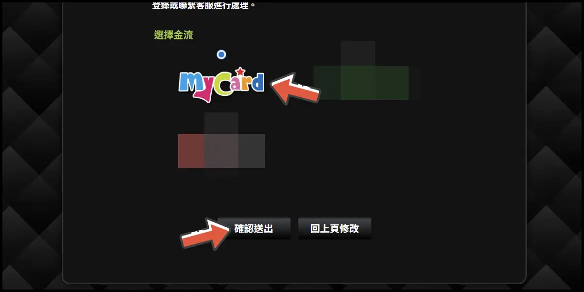 金流選擇「MyCard」,並點選「確認送出」前往儲值。
