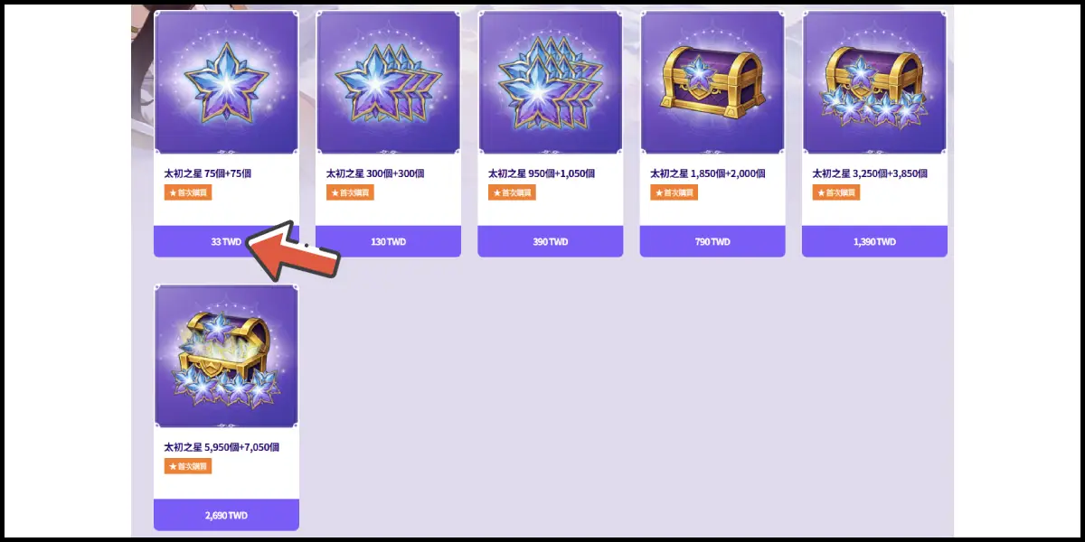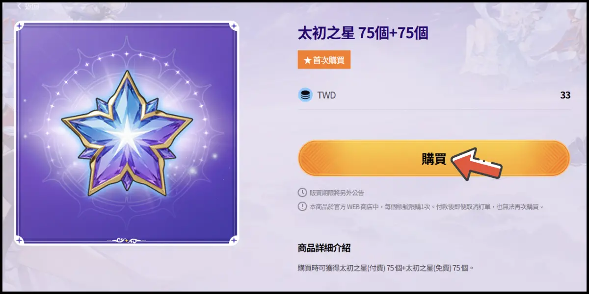 選擇儲值商品,確認商品後點擊「購買」。(WEB商店首次購買享福利喔~)