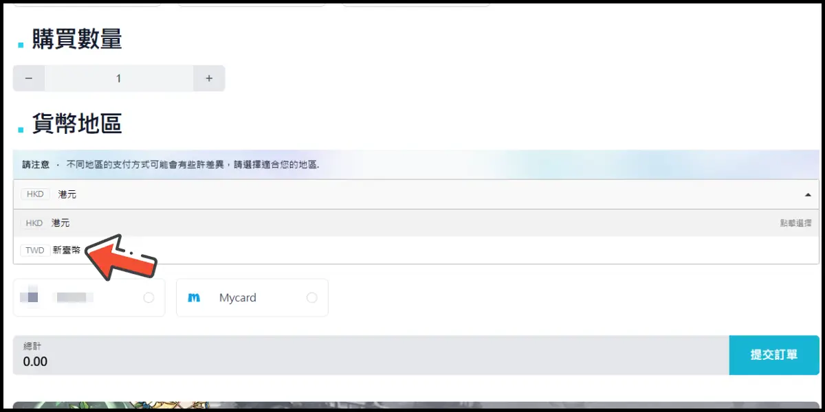 選擇您想要儲值的遊戲的伺服器和帳號,貨幣地區選擇「TWD新台幣」。