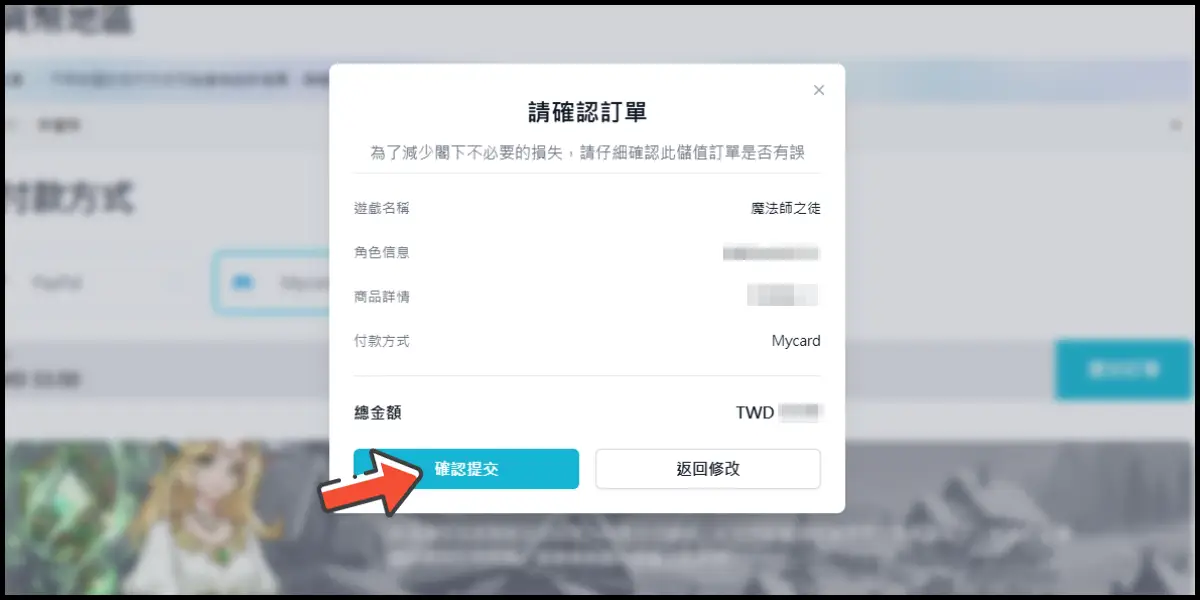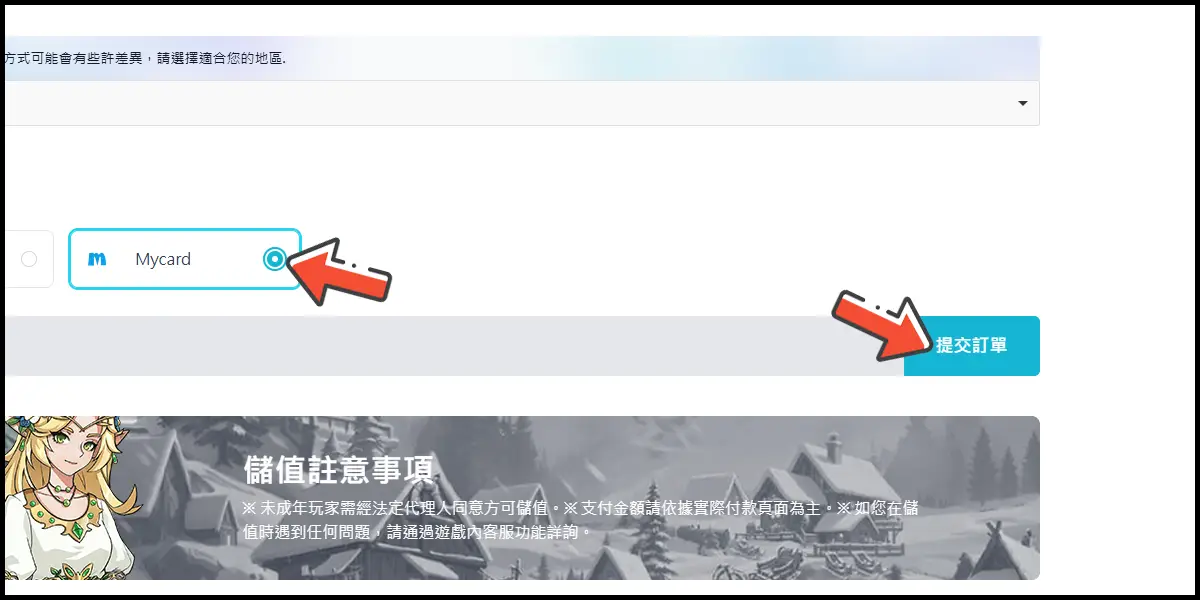 選擇儲值金額,支付方式選擇「MyCard」並提交訂單,檢查訂單資訊無誤後按下「確認提交」。