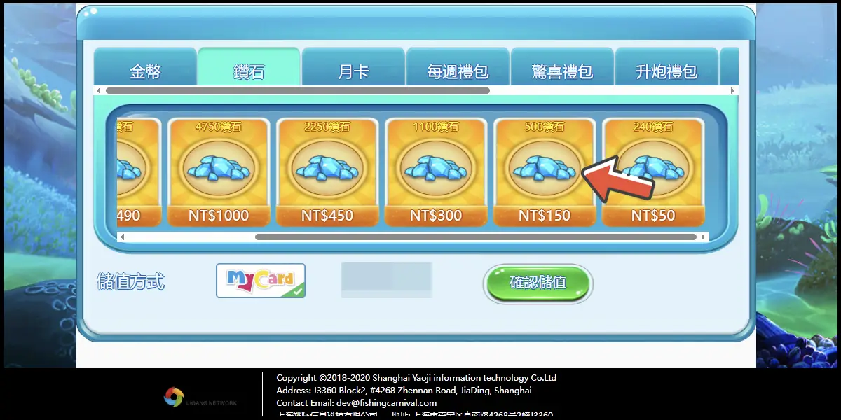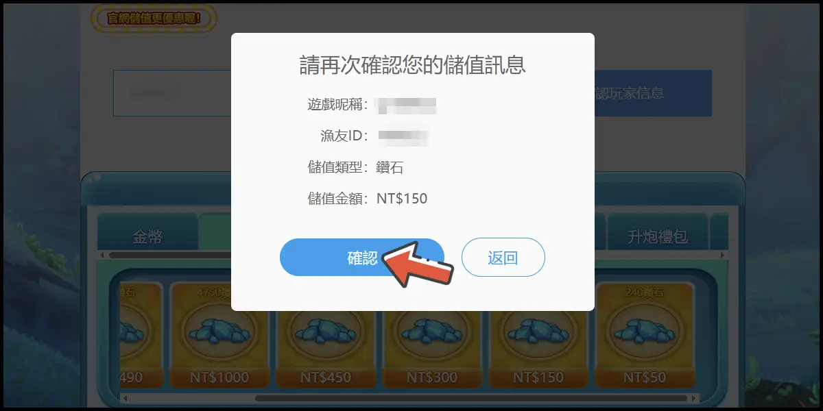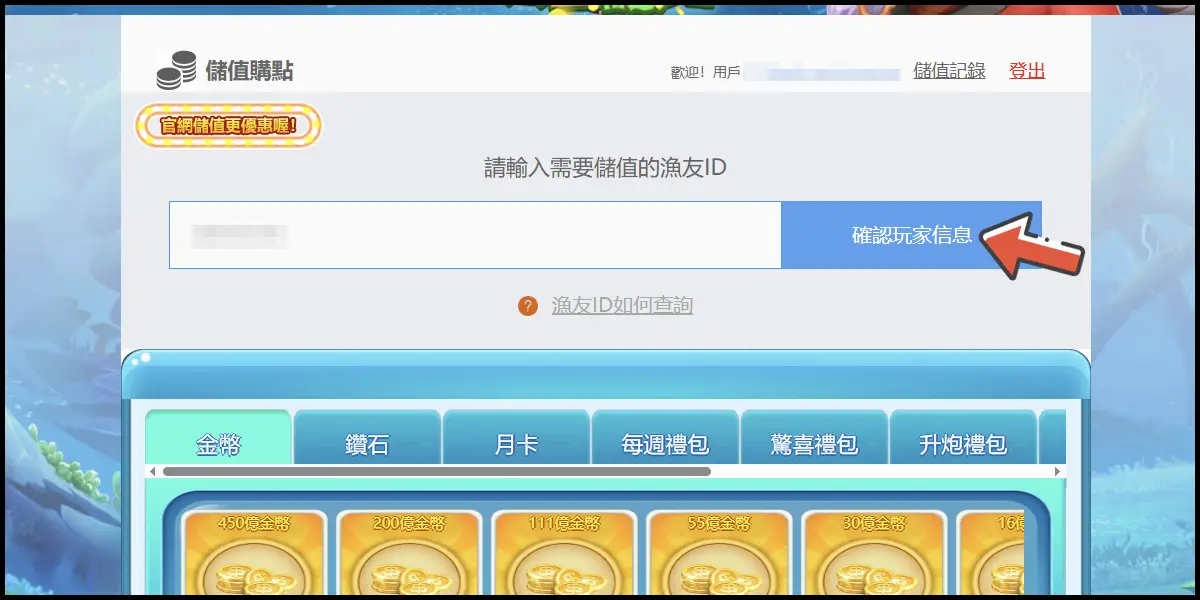 輸入玩家ID並點擊「確認玩家訊息」,並選擇儲值商品。