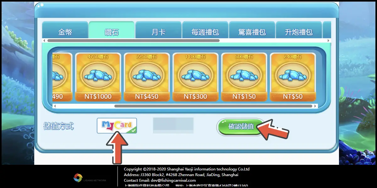 儲值方式選擇「MyCard」並點擊「確認儲值」,確認訂單無誤後按下「確認」。