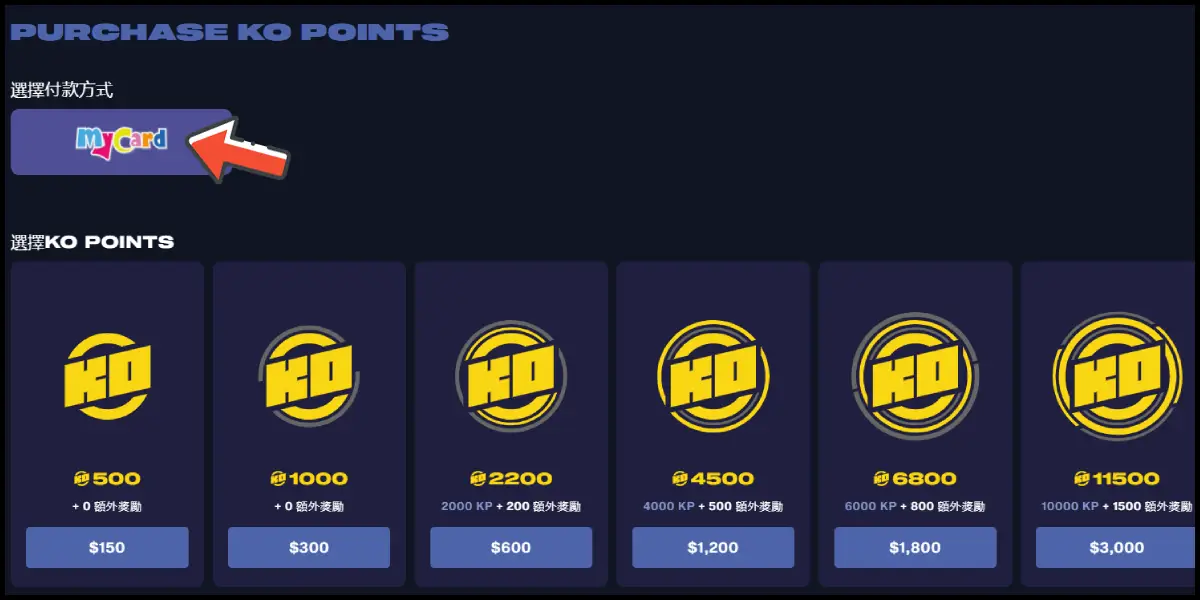 付款方式選擇「MyCard」,並選擇儲值金額。
