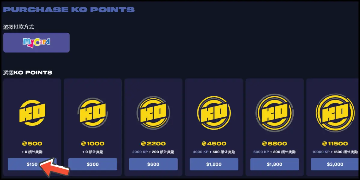 選擇儲值品項。(除KO點數,進去後需再點一次商品金額才可進入儲值畫面)