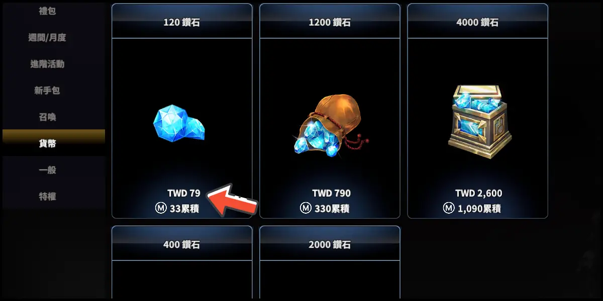 進入遊戲後,選擇現金商城,並選擇儲值商品。