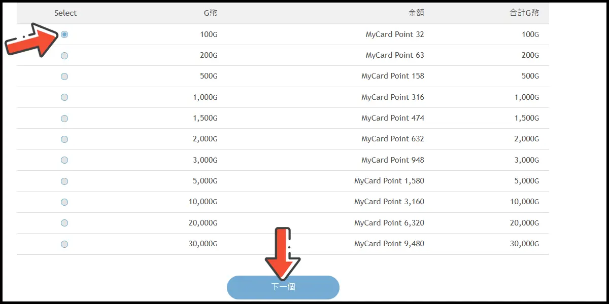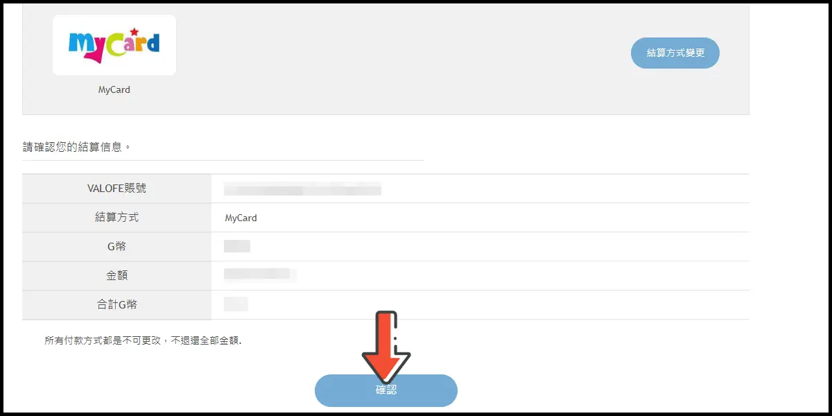 結算方式選擇「MyCard」,選擇儲值商品後,檢查訂單資訊無誤按下確認。