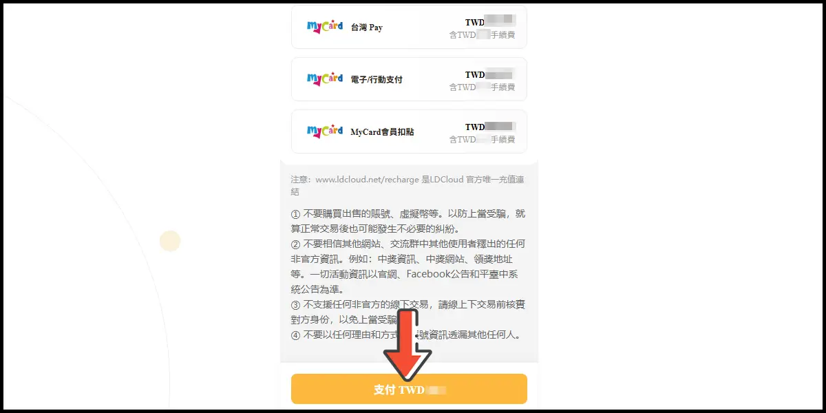 確認商品資訊與遊戲帳號無誤後,點選下方「支付TWD」。