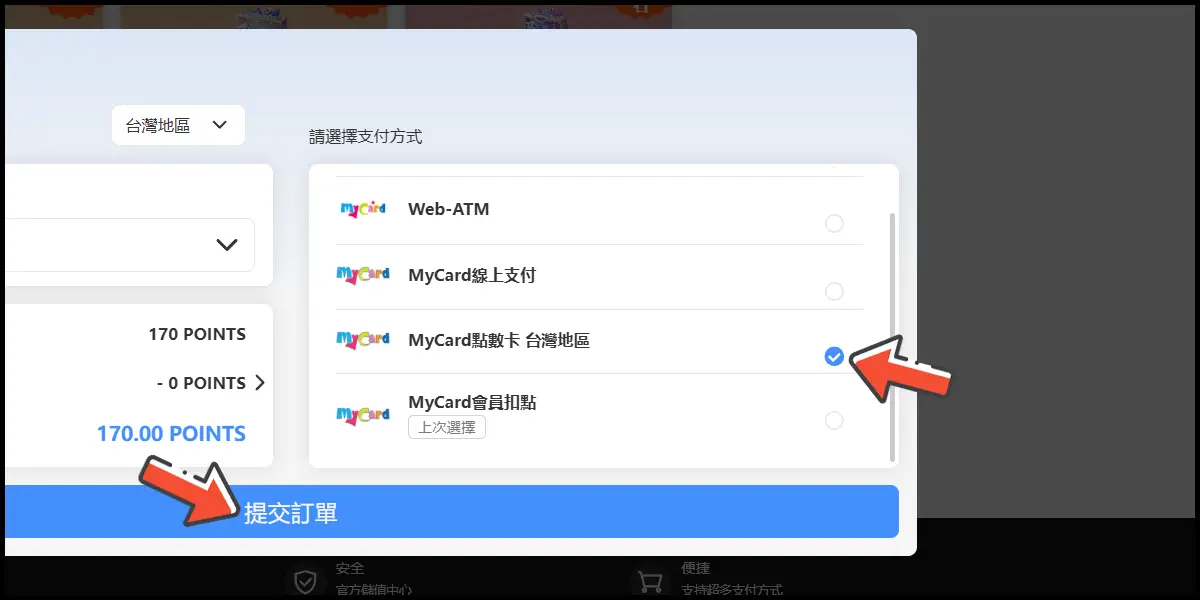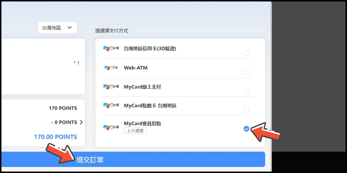 選擇「MyCard點數卡 台灣地區」,並提交訂單。