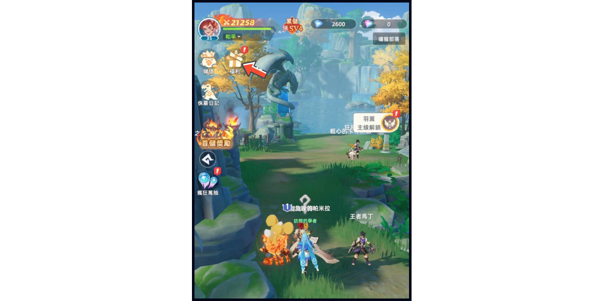 1、登入遊戲並將角色練至35等後,點擊左上角【福利】
