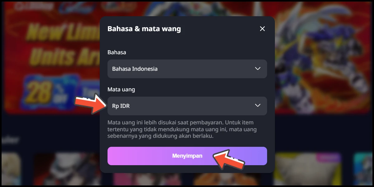 Klik opsi bahasa dan mata uang, pilih Rp IDR sebagai mata uang yang digunakan, lalu klik tombol Menyimpan.