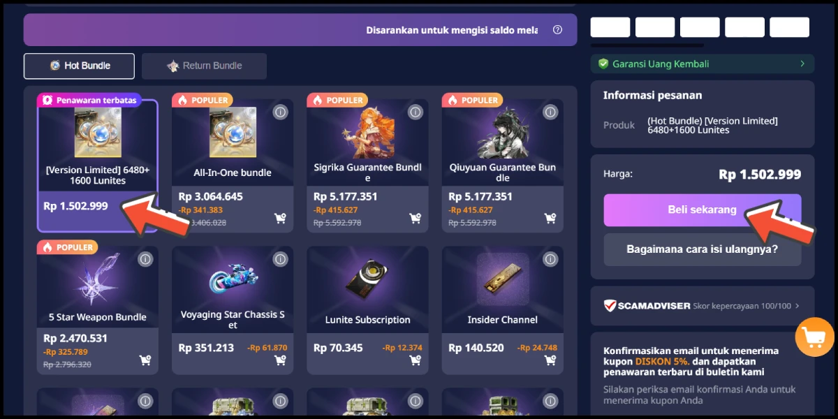 Pilih item yang ingin Anda top up, lalu klik tombol Beli Sekarang.